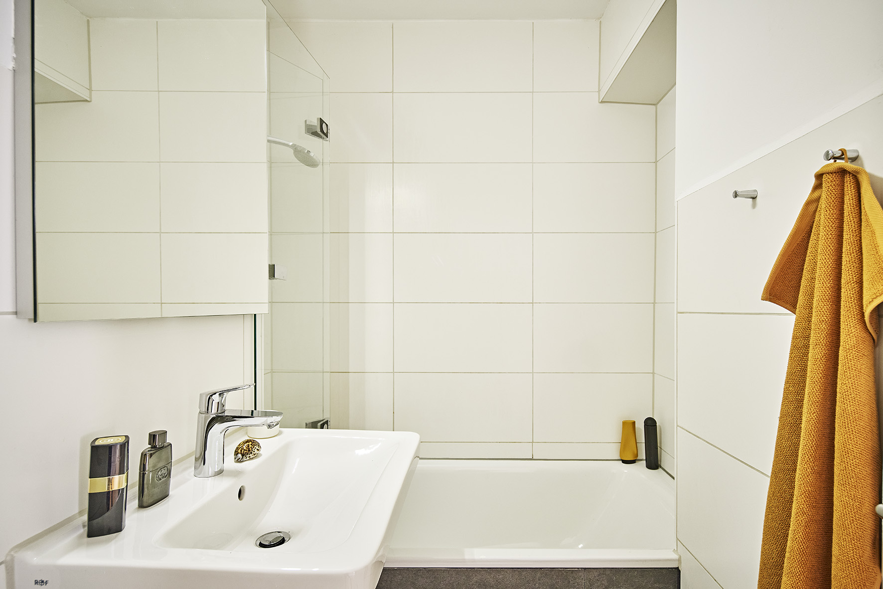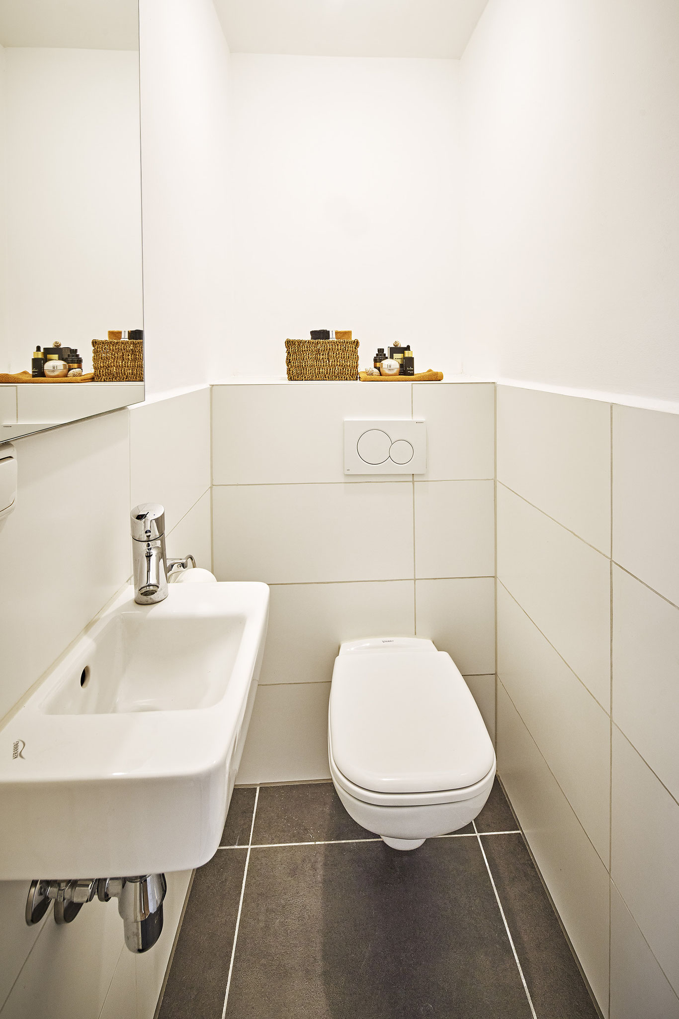 Bereits zu einem früheren Zeitpunkt wurden das Badezimmer und das separate WC modernisiert. Beide präsentieren sich in einem zeitlosen Schwarz-/Weiß-Look.