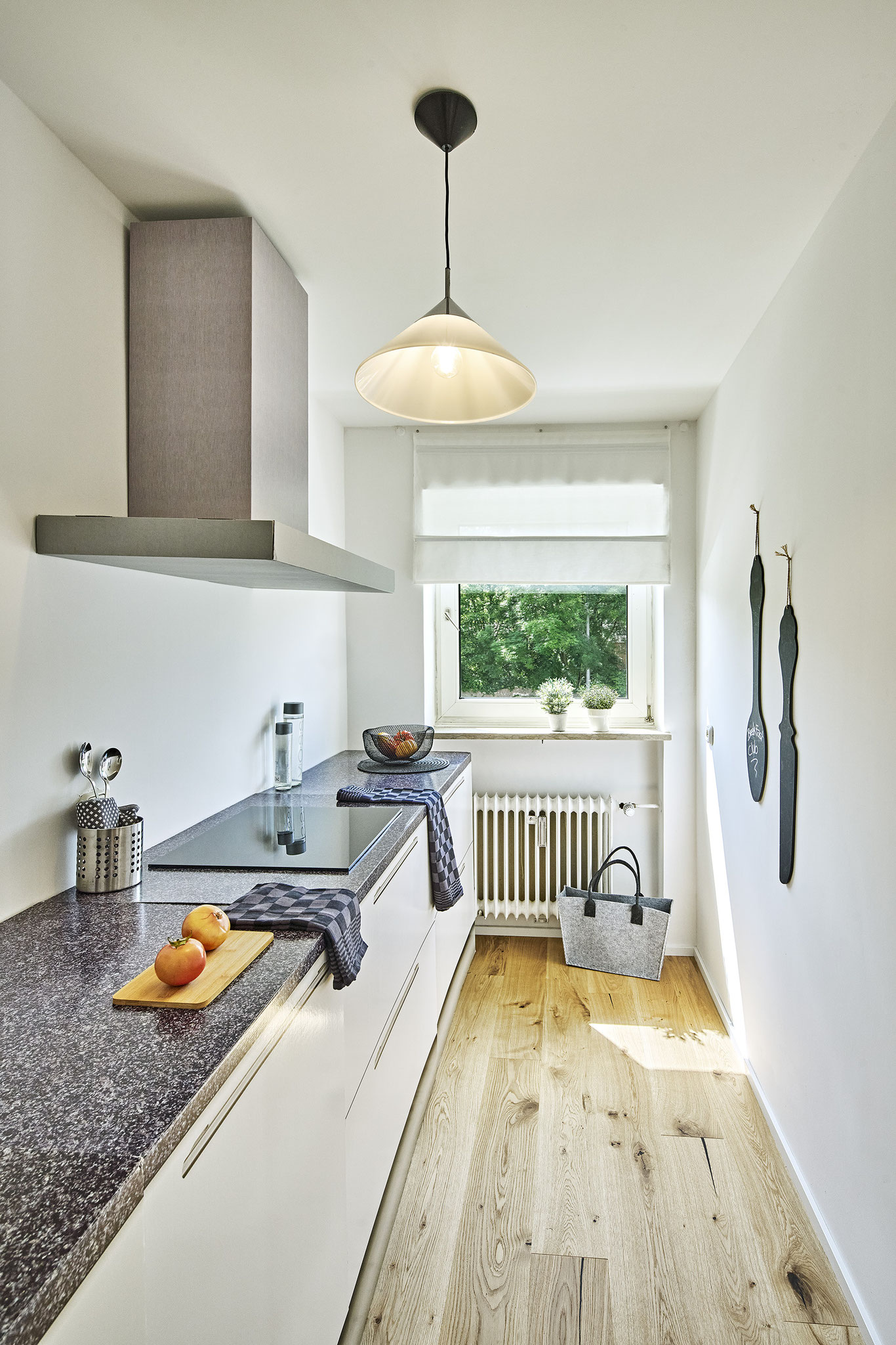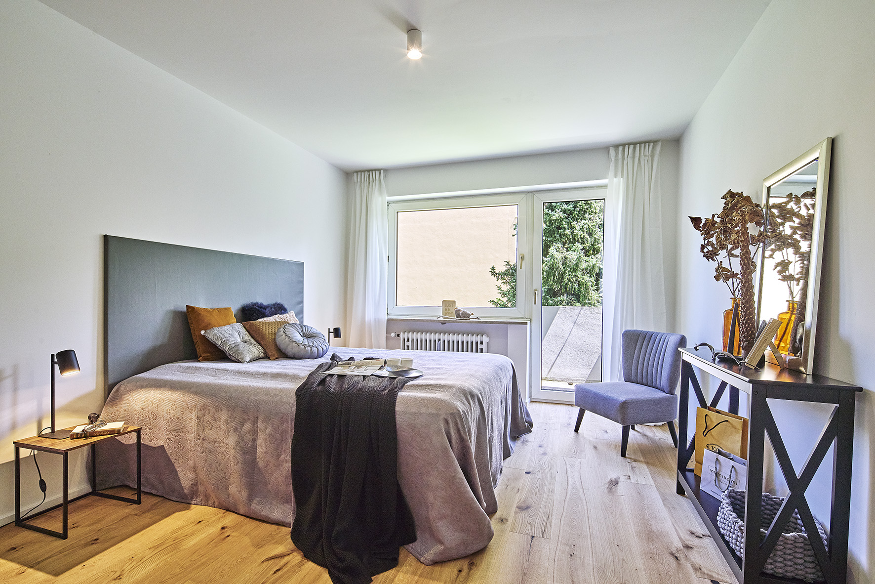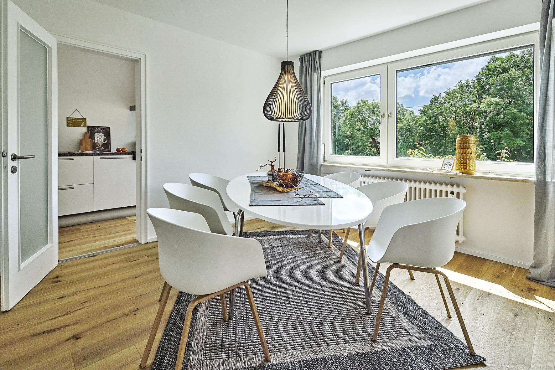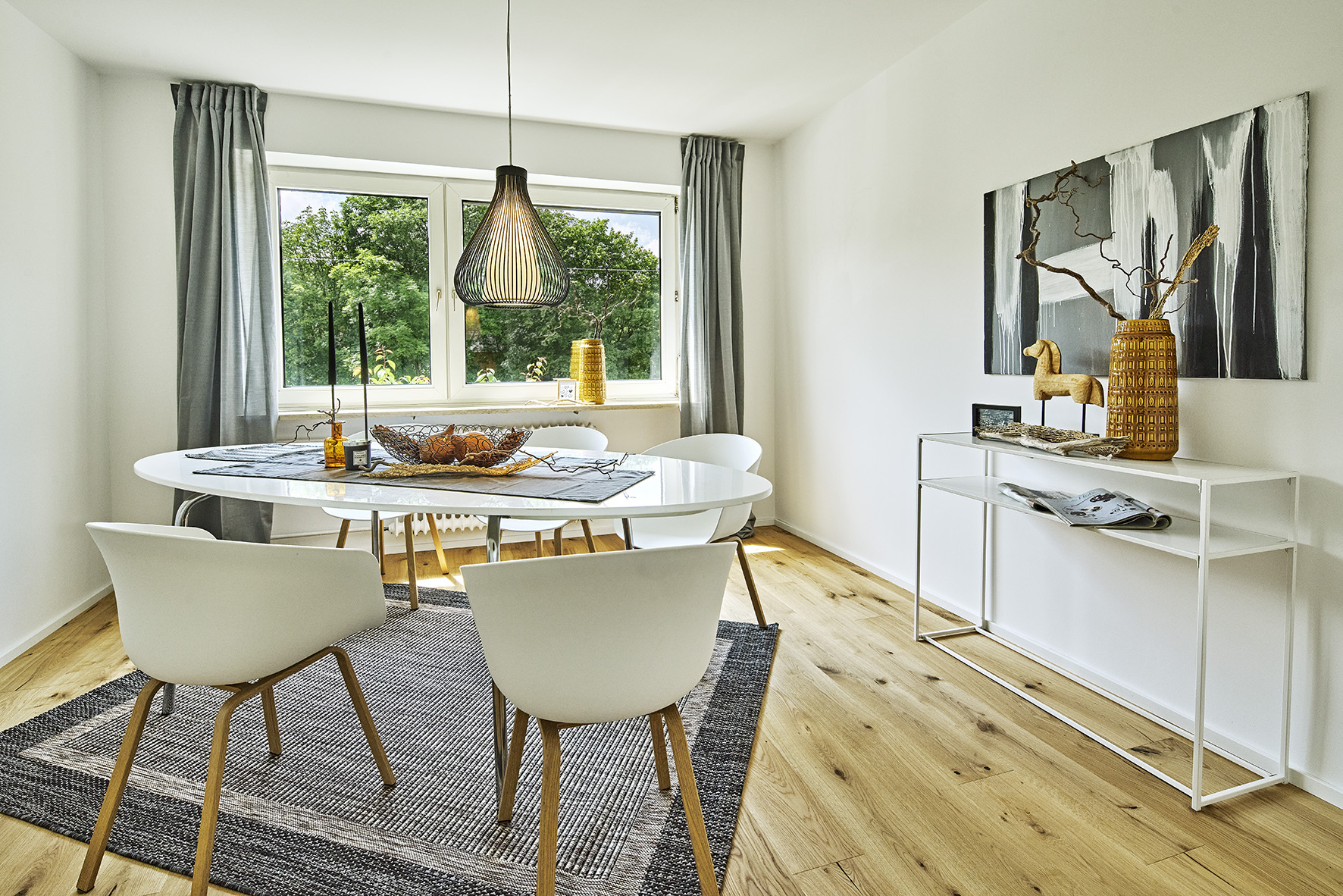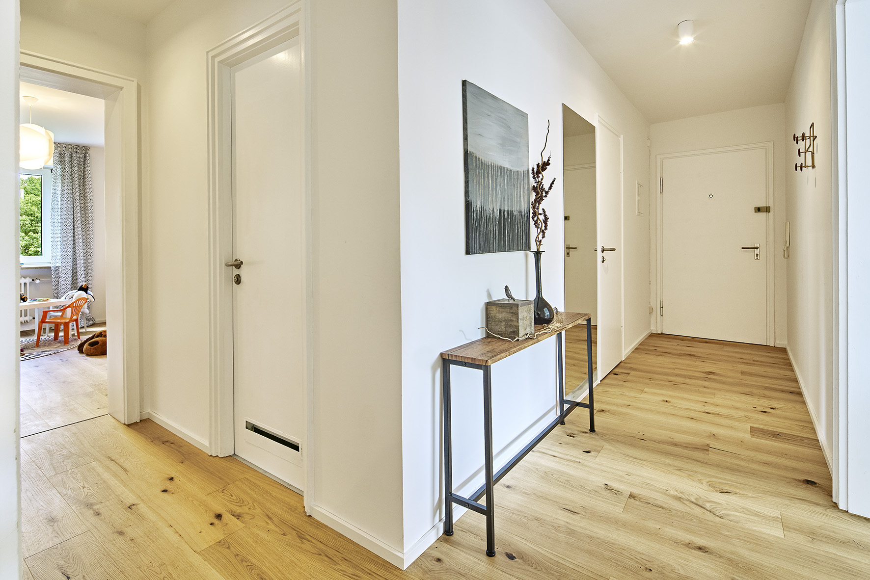 Im Zuge der erst kürzlich abgeschlossenen Renovierung wurde in Diele, in allen Wohn- und Schlafräumen sowie in der Küche ein einheitliches Eichendielenparkett verlegt. Dadurch erscheint die Wohnfläche noch großzügiger. Der helle Farbton trägt zusammen mit viel Tageslicht durch die großen Fenster zu einem positiven, freundlichen Ambiente bei.
