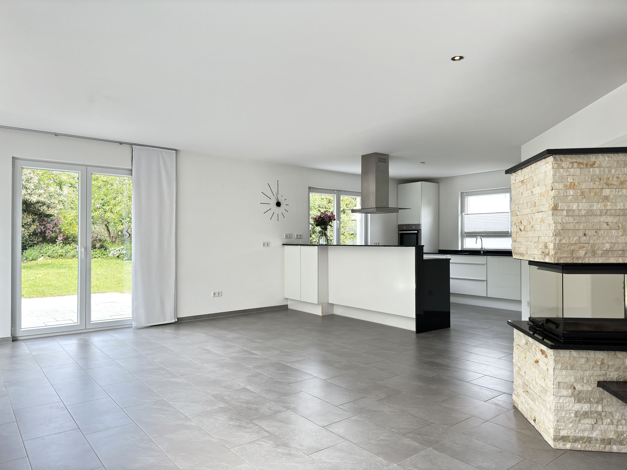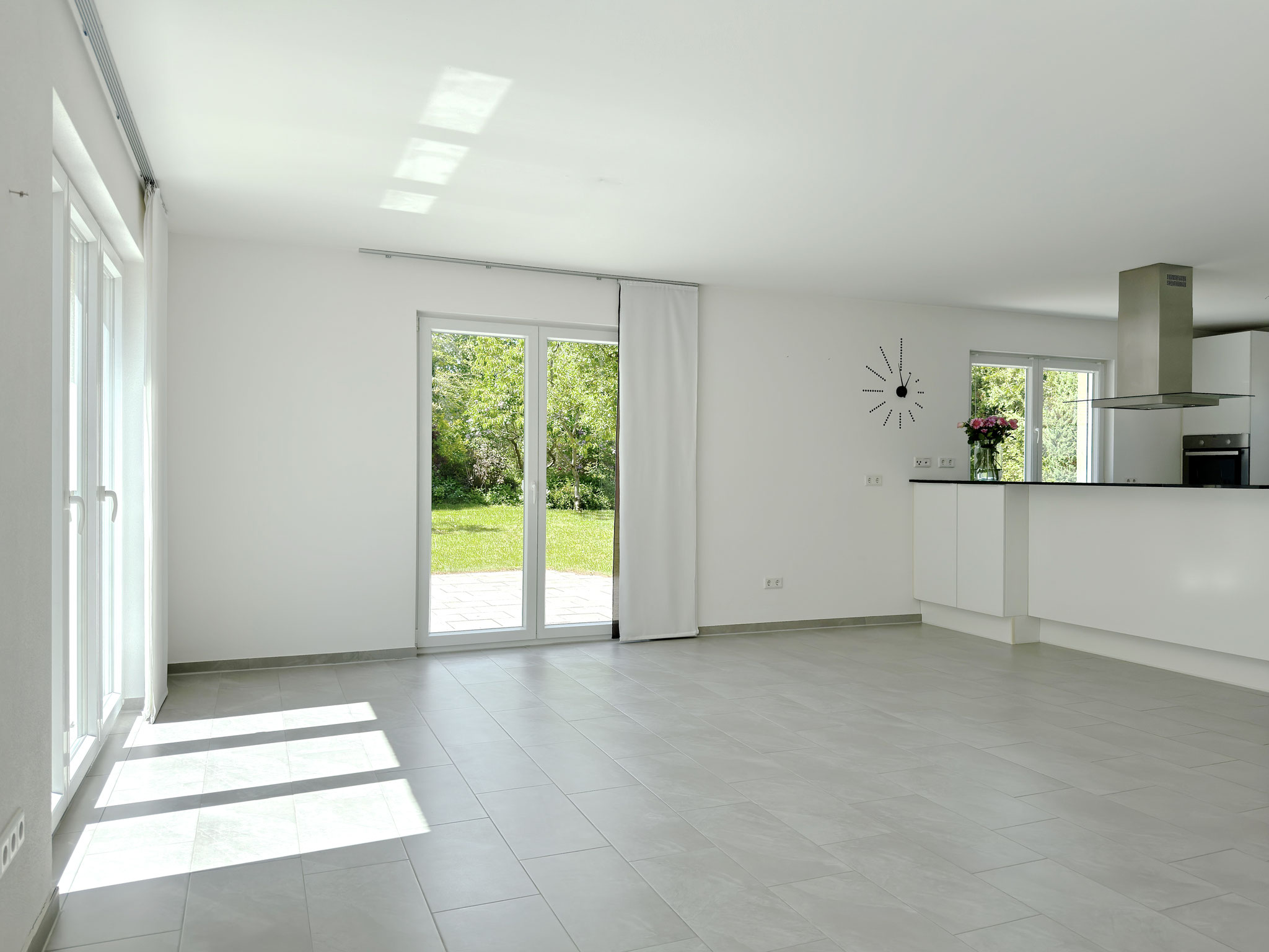 Ein erstes, repräsentatives Highlight ist sicher der Wohn-Essbereich mit offener Küche auf ca. 56,31 m², der das helle und sonnige EG prägt. Lichtgraue, großformatige Feinsteinzeug-Fliesen, bodentiefe Terrassentüren und Fenster zu allen Himmelsrichtungen geben den Blick frei in den wunderschön bepflanzten, geschützten Garten und lassen den Raum strahlen.