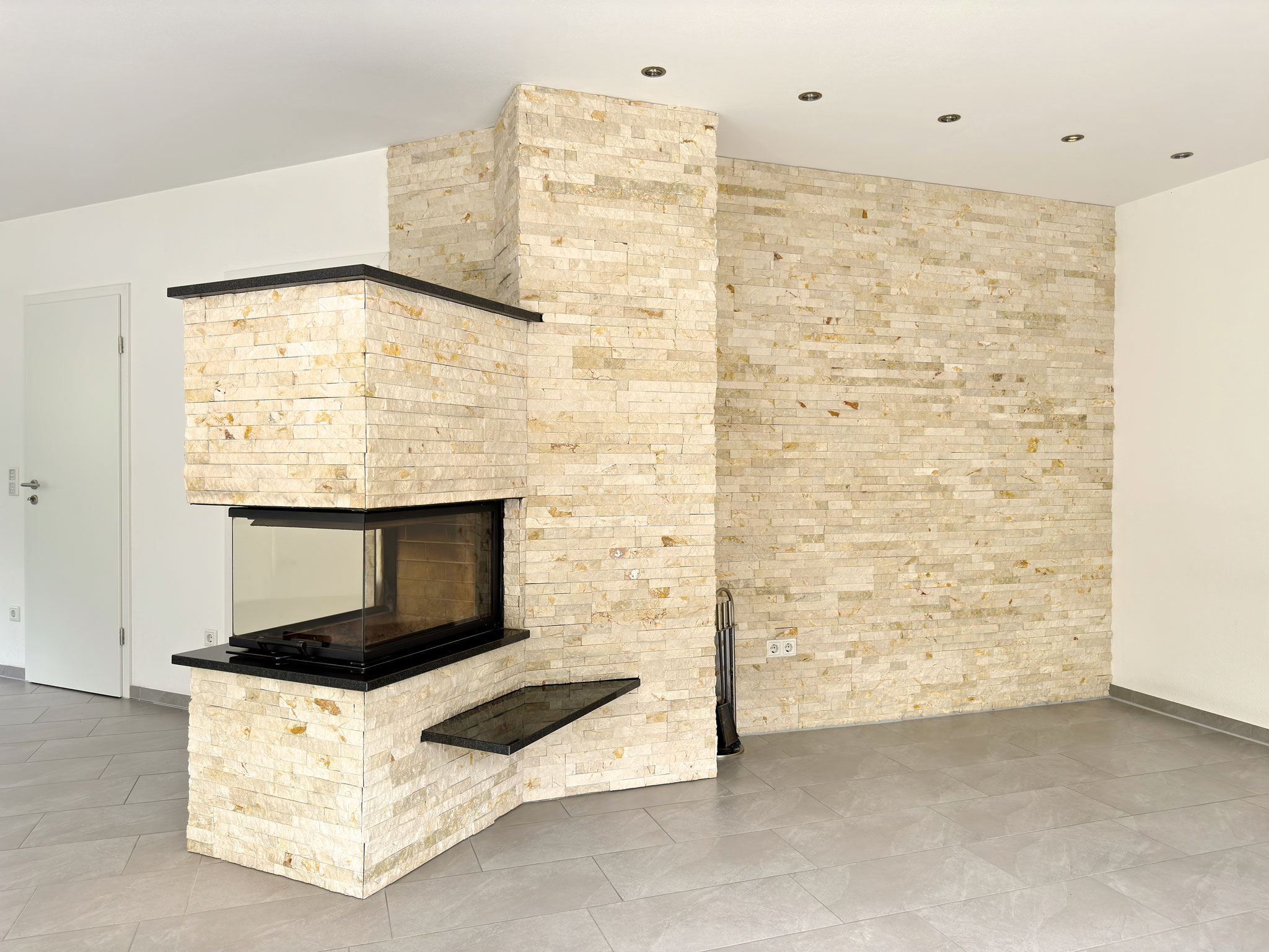 In der kalten Jahreszeit sorgt ein zu drei Seiten offener Kamin vor einer lebendigen Natursteinwand für zusätzliches Wohlgefühl.
