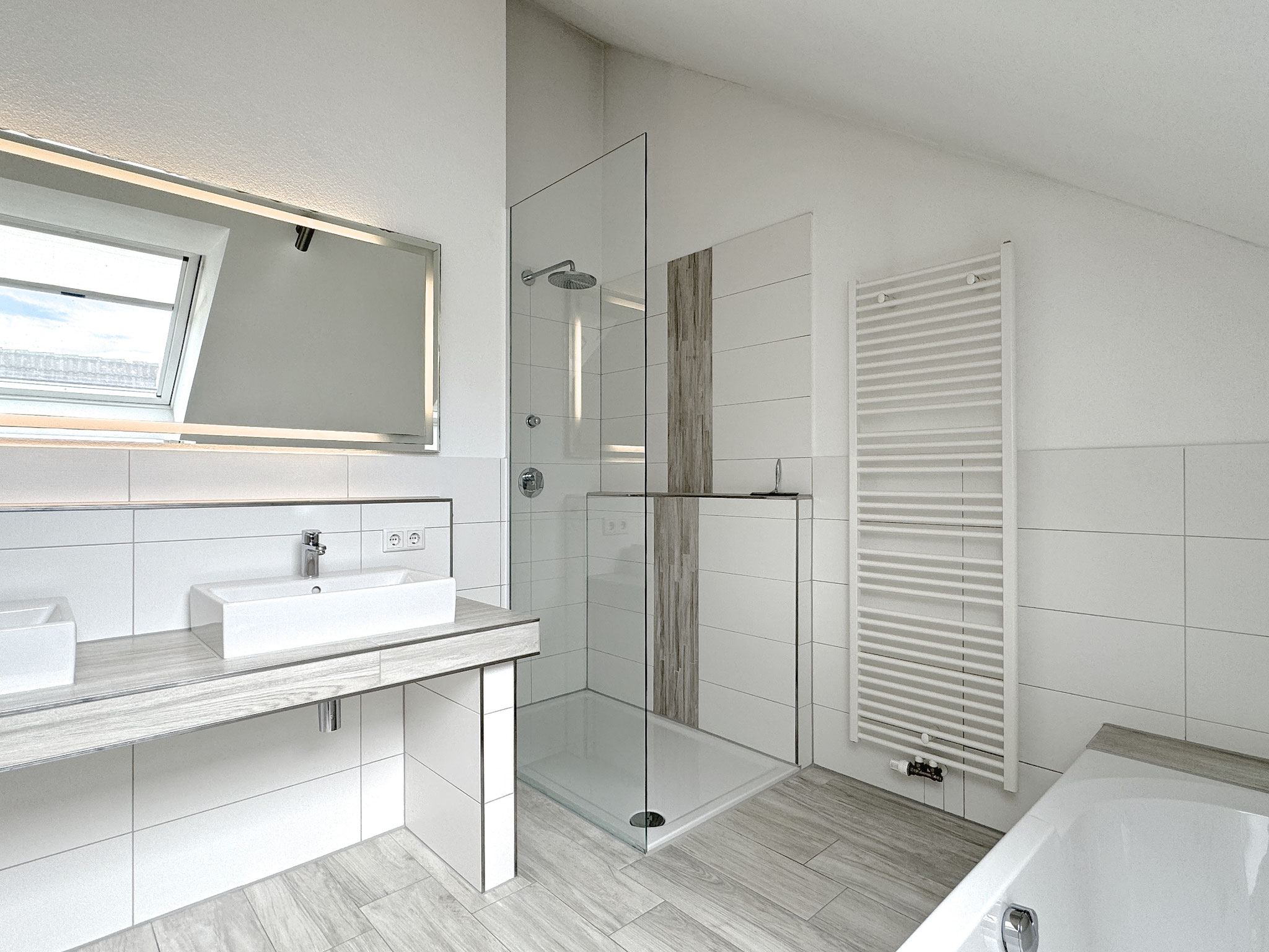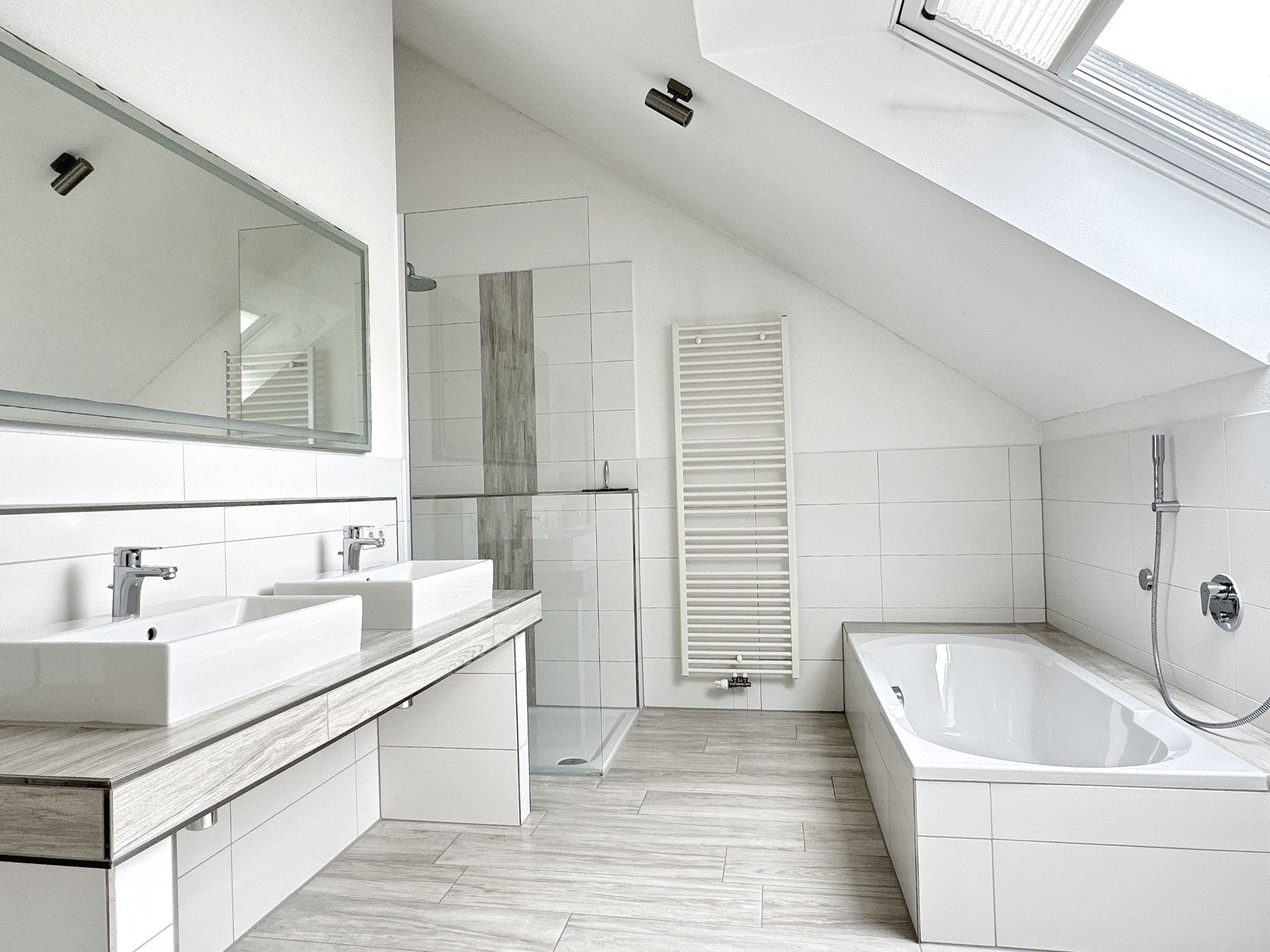 Ein Luxus an Raumgefühl ist das mit ca. 12,27 m² äußerst großzügige Badezimmer. Ein Doppel-Waschtisch mit beleuchtbarem Spiegel über die gesamte Breite, eine eingelassene Partner-Badewanne und die Walk-in Dusche mit Rainshower machen das Badezimmer zu einer Wellness-Oase. Viel Sonne und Licht bekommt der Raum über ein großflächiges Dachfenster, das bequem elektrisch zu öffnen und auch zu verschatten ist. Die Sanitärkeramik inkl. WC ist von Villeroy & Boch oder Vigour. Es wurden ausschließlich Marken-Armaturen verbaut. Hochwertige, glasierte Fliesen in Holzoptik Eiche gekalkt runden den positiven Eindruck ab.