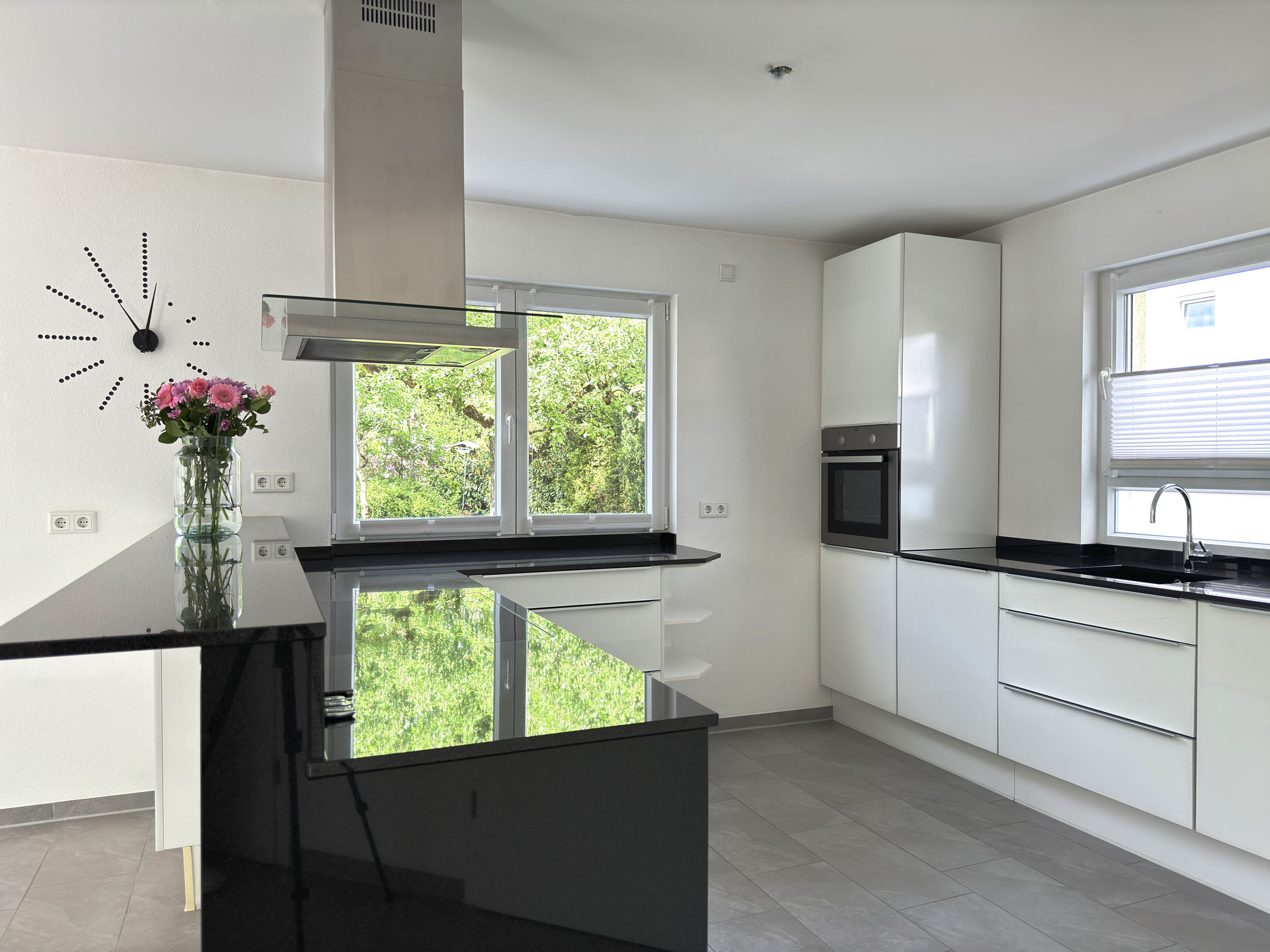 Die hochwertige Einbauküche mit Kochinsel ist mit Markengeräten voll ausgestattet und trägt mit ihren weißen Glasfronten und der dunklen Granit-Arbeitsplatte zum Eindruck bei.