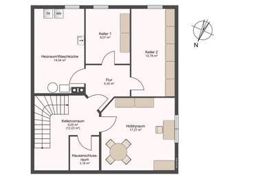 Über die wunderschöne Holztreppe mit ihrem minimalistischen Geländer und Handlauf gelangen Sie ins UG. Hier finden Sie einen Hobbyraum mit Tageslicht in Wohnraum-Qualität und neben einem ebenfalls großzügigen Hauswirtschaftsraum mit allen Anschlüssen zwei weitere gepflegte und gut nutzbare Räume.